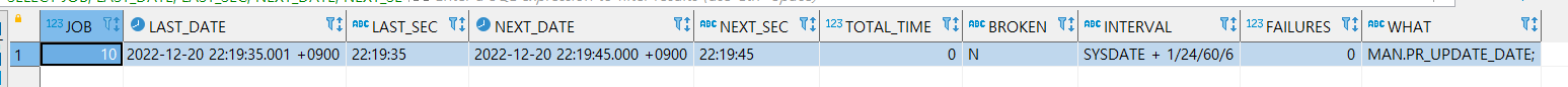 최초 1분 뒤 Job이 수행된 이후 10초 간격으로 꾸준히 job이 수행되어 REG_DT에 SYSDATE가 INSERT된 것을 확인할 수 있습니다.