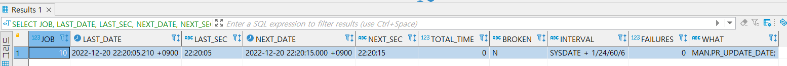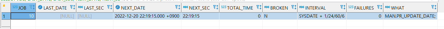 위에서 만든 PR_UPDATE_DATE 프로시저를 JOB 생성 후 1분 후 최초 수행하고 그 뒤로는 10초 간격으로 계속 프로시저가 실행되는 JOB을 만들어 보겠습니다.
