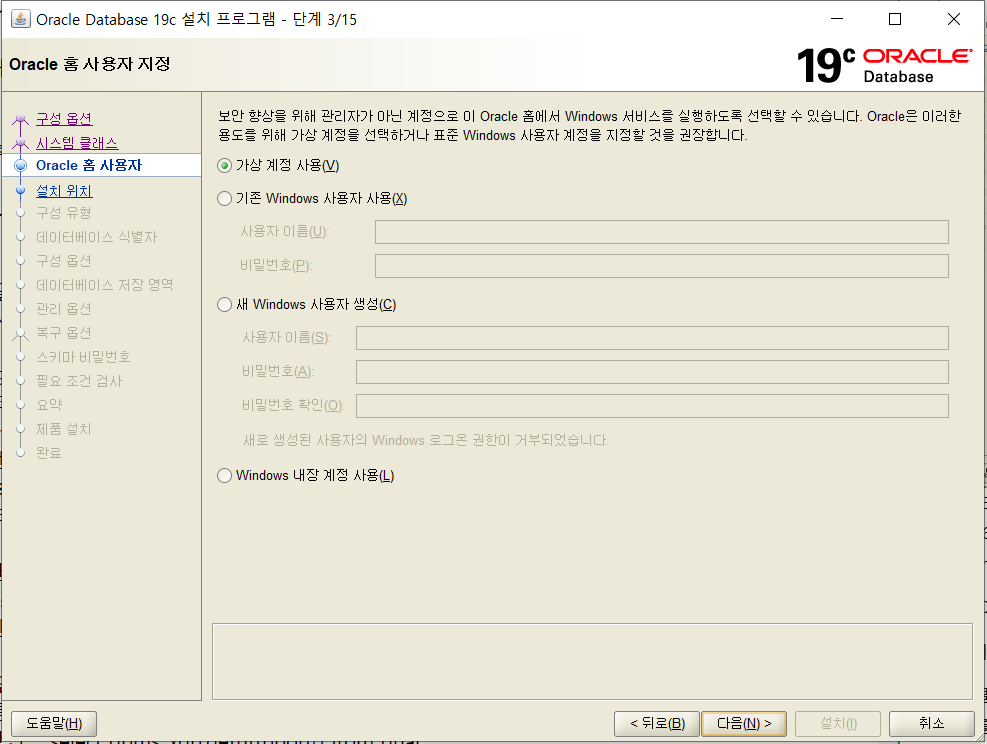 6. 가상 계정 사용을 선택합니다. (오라클 권장 사항임)