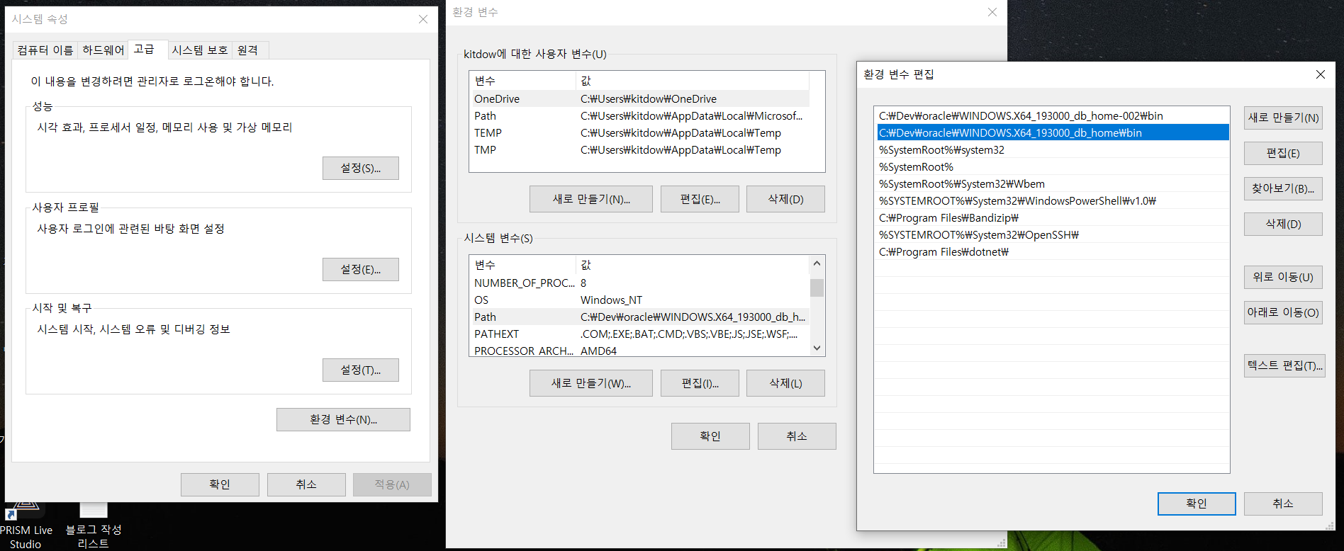 6. 고급 -> 환경 변수 -> 하단 시스템 변수의 Path클릭 후 편집 -> Oracle 관련 변수 삭제