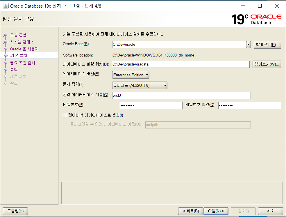 7. 전역데이터베이스 이름과 비밀번호를 지정합니다. (대문자1, 특수문자1포함 권장) 컨테이너 데이터베이스로 생성은 체크 해제합니다.