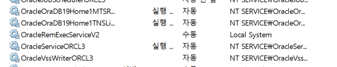 2. 서비스 리스트 중 Oracle~ 로 시작하는 모든 서비스 마우스 우클릭 후 중지합니다.